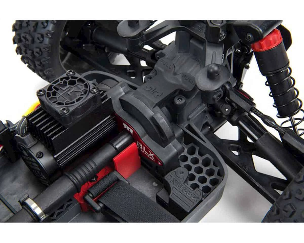 Its full-time 4WD transmission uses strong front, rear, and centerline telescopic driveshafts that can’t be lost during heavy impacts, unlike dogbones. A simple, dependable, responsive steering assembly complements the ultra-reliable drive system and features a servo horn with built-in servo saver. The TYPHON 4X4 3S BLX RTR includes the waterproof Spektrum SPMS651 metal-geared digital servo for 15% more torque than the previous version’s ADS-7M servo.