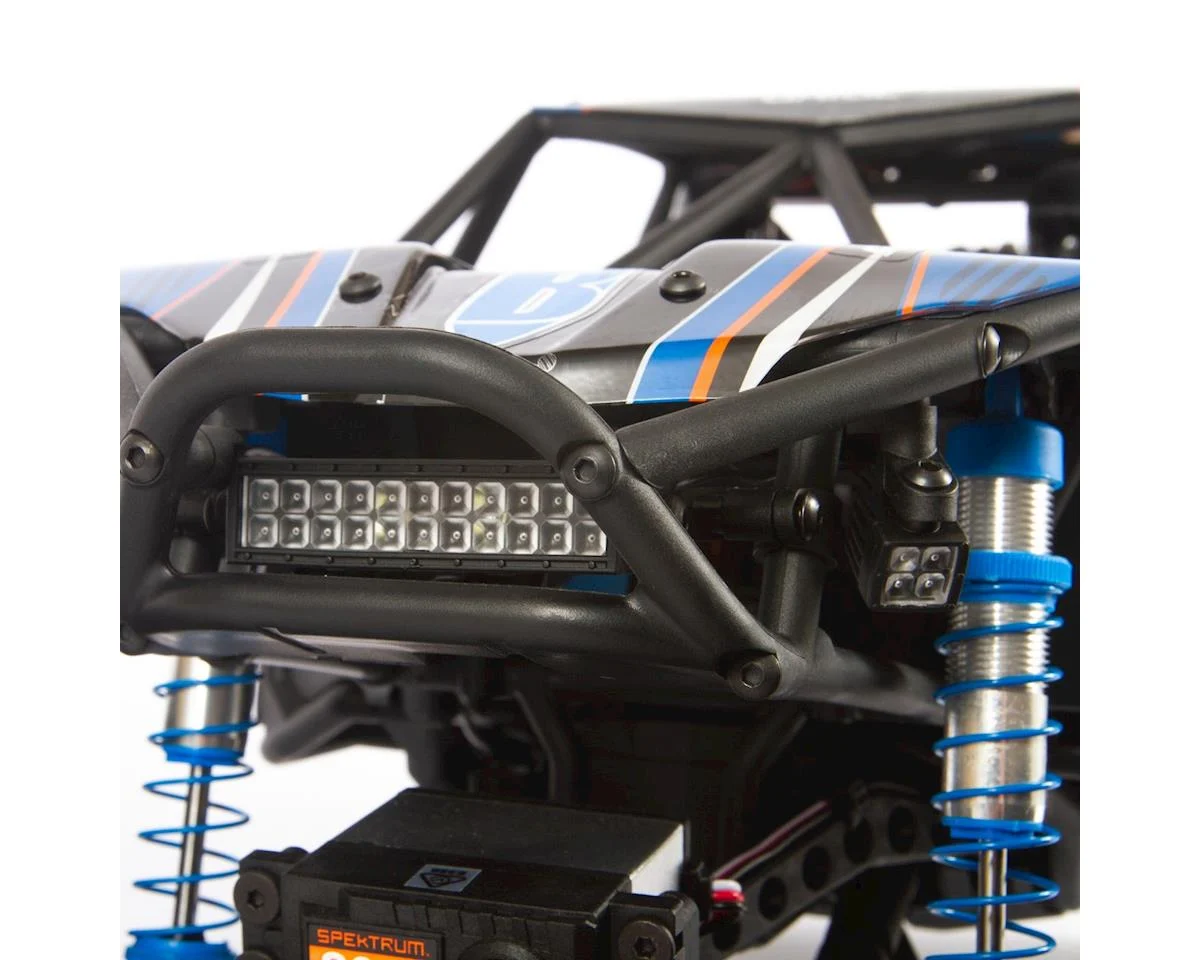 The included 3S LiPo capable Dynamite AE-5L ESC with IC3 connectors features adjustable drag brake and a light controller with dual LED outputs to accommodate the LED headlights and tail lights. The RR10 Bomber rock racer now features two forward-facing white LEDs, two white LEDs on the front for rock lights, and a rear LED light bar with two red LEDs.