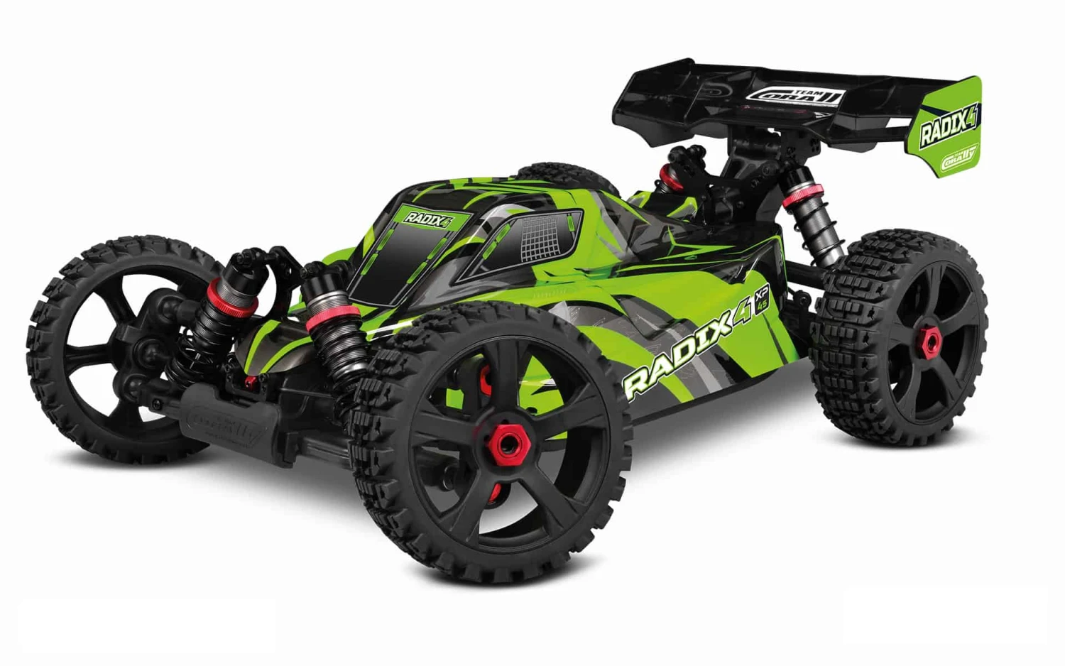 Utilizing a durable, efficient all-metal four-wheel drivetrain, fully independent suspension, racing chassis and aerodynamic, high-downforce racing bodyshell design with fresh new graphics and colors, the Radix 4 is the electric 1/8 buggy for anyone looking for awesome speeds, unsurpassed handling, outstanding durability at a surprisingly affordable price.