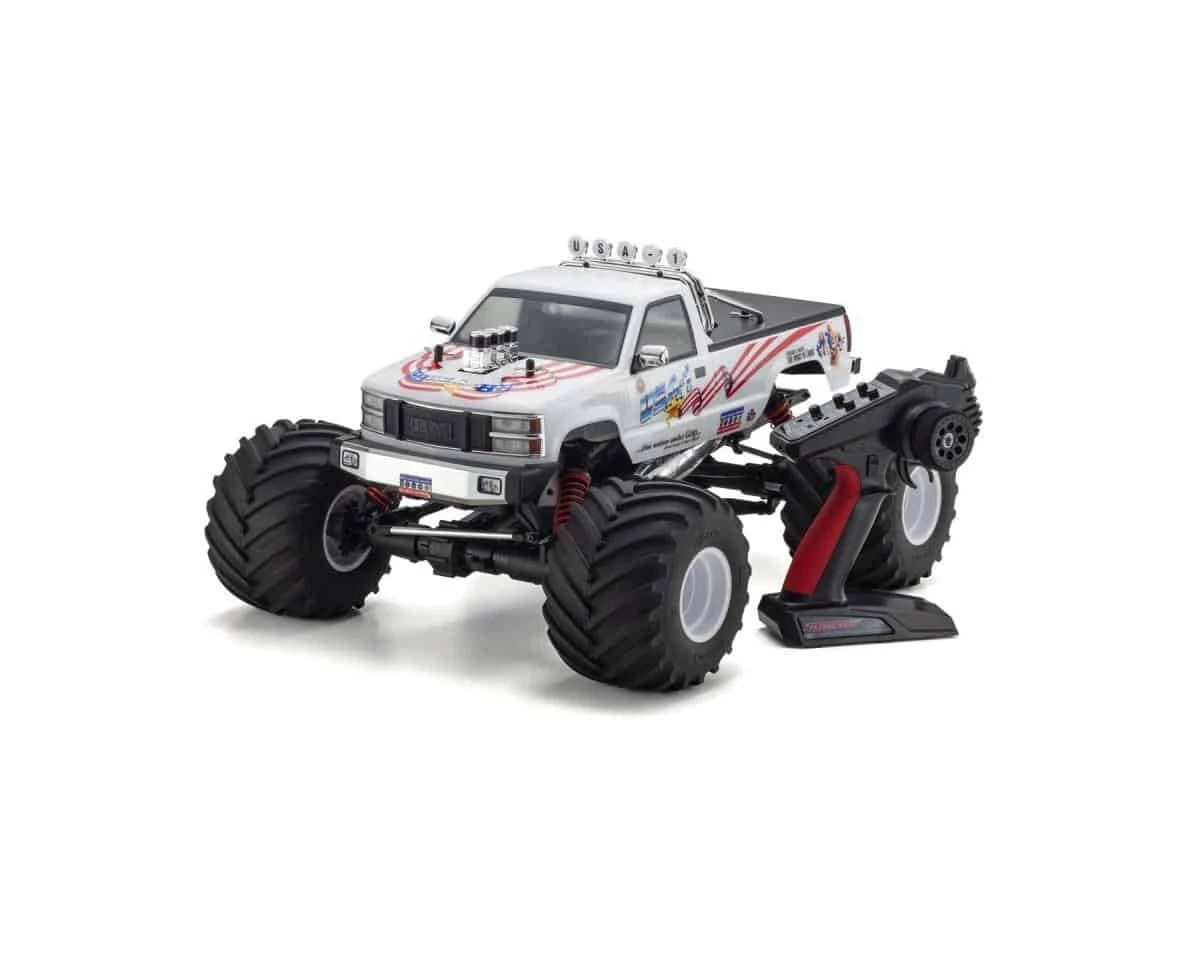The Kyosho Monster Kruiser USA-1 GP 1/8 ReadySet Nitro Monster Truck pays homage to the classic Nitro USA-1. This truck set the standard for Monster Truck power and performance when it was released in 1990. 30 years later, the torch has passed to the latest Nitro USA-1, which outperforms the original in EVERY respect. Yes, it’s that much better – and this awesome Readyset package is built for you! Add your batteries, nitro fuel and glow plug heater and you are ready to run.