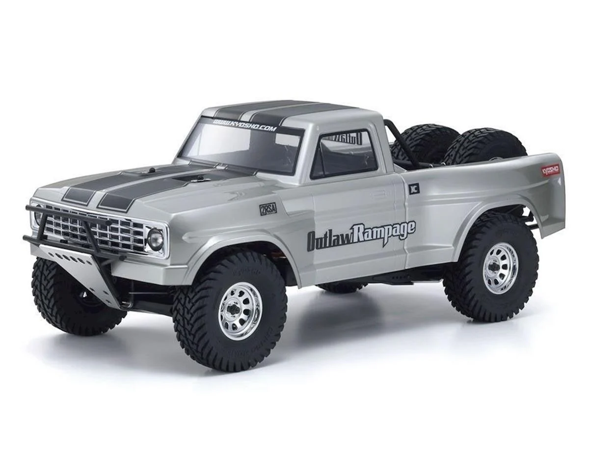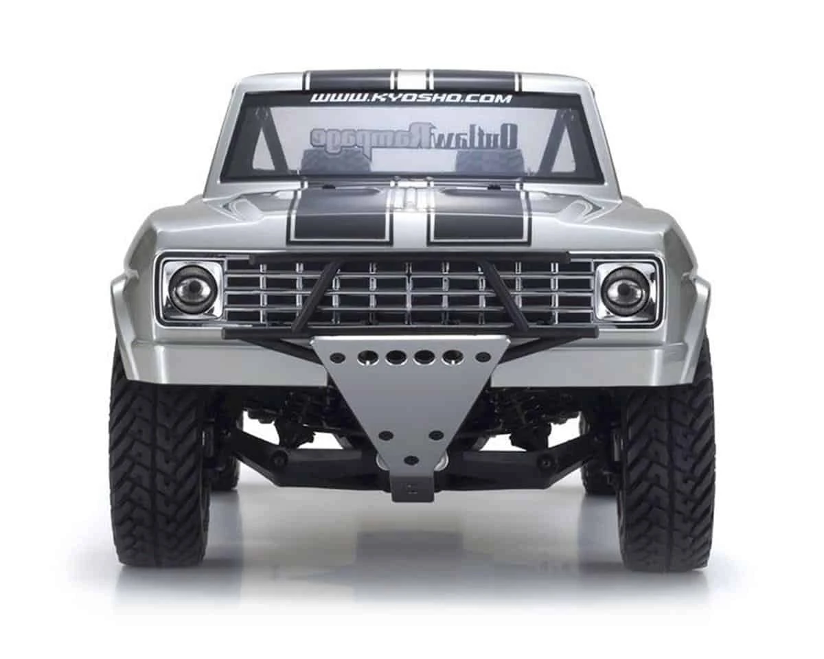 The Kyosho Outlaw Rampage PRO 1/10 Scale Electric 2WD Trophy Truck Kit embodies the defining mechanics of a real production model trophy truck. The 2WD Outlaw Rampage PRO is about 70% pre-assembled in an Almost Ready to Run kit, including the optional upgrade components that mark this machine as a “PRO” version. The superior running stability and overall functionality of this rear wheel 2WD is realized from the roll cage, long stroke aluminum oil shocks, stabilizers on front and rear with 3 different wire gauge settings, and aluminum skid pads that protect the chassis. With easy controllability and wider scope for setting adjustments, the true dynamic performance of 2WD truck racing is in your hands.