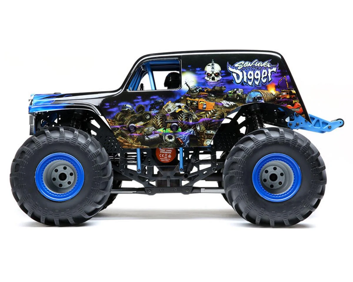 The Losi LMT Son Uva Digger RTR 1/10 4WD Solid Axle Monster Truck with DX3 2.4GHz Radio is breaking into the market with an unbeatable combination of all-out performance, impressive scale detail and iconic good-looks.