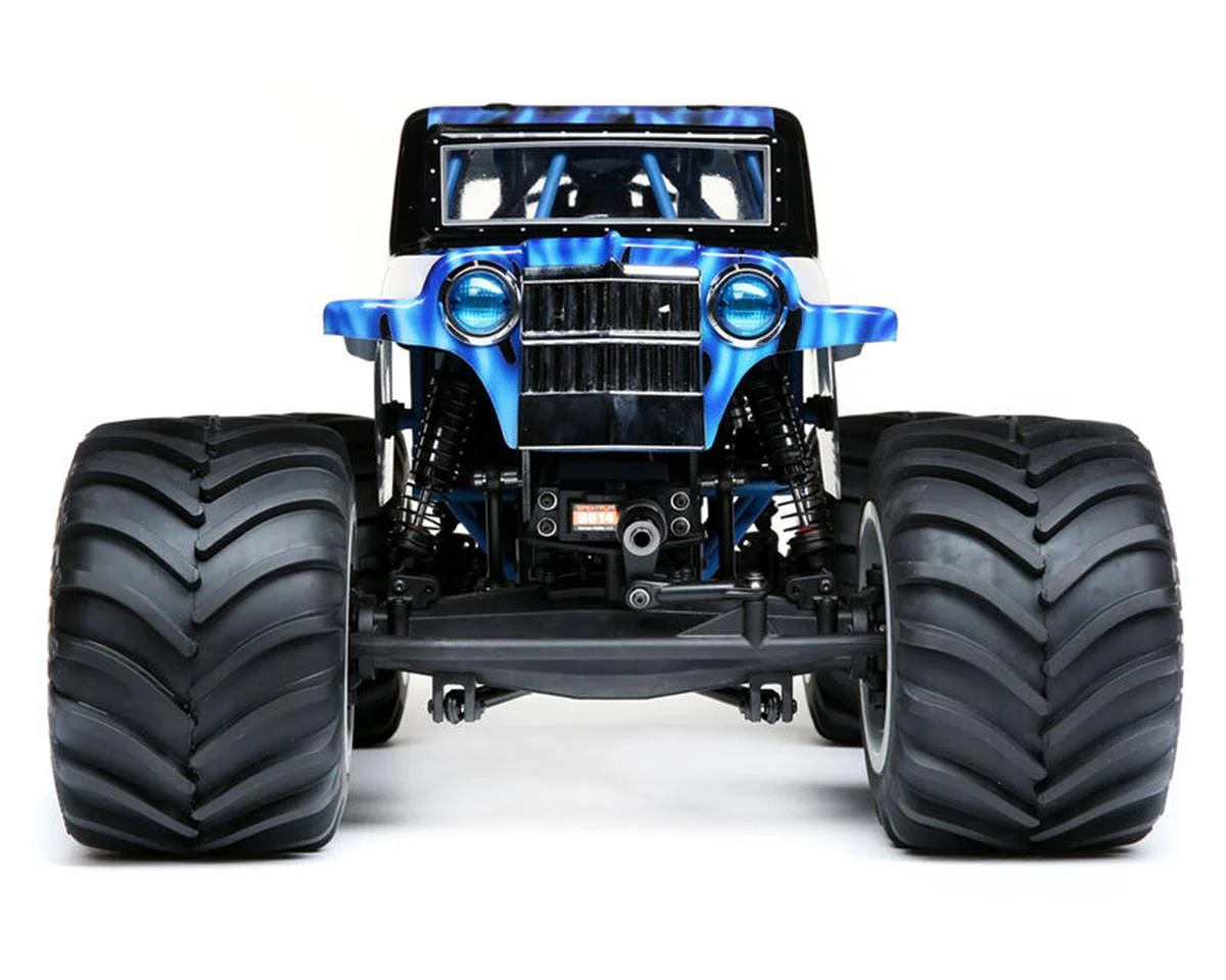 This Monster’s features start with the chassis, with a twin vertical plate designed to provide all the performance adjustments needed to tune the truck for any situation. Whether you are a scale driver, a basher or a racer, the chassis is designed to accommodate multiple shock setups keeping you tracking straight on any terrain. Updated multi-piece axle housings surround the 1/8th scale drivetrain. Additionally, the easy access center transmission comes stock with a center differential and allows for quick changes with the optional spool for that wheel standing action. For the true Monster truck experience, the axles also allow for optional 4-wheel steering and an adjustable servo saver to keep the wheels pointed in the right direction. A composite flip top cage adds scale realism and protection while giving easy access to the battery and electronics. The LMT Monster Truck has entered the solid axle, and is a great RTR option when you want to crush your competition.