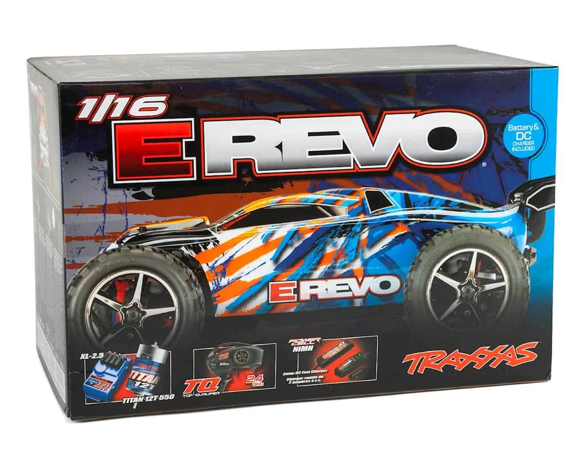 The 1/16 E-Revo is fully assembled with TQ 2.4 GHz radio system, Titan 550 motor, XL-2.5 electronic speed control, painted and decaled body, pre-glued tires, and detailed instructions. An iD-Equipped Traxxas Power Cell NiMH battery and 2-amp peak detecting DC fast charger are also included, making the 1/16 E-Revo truly Ready-To-Race.