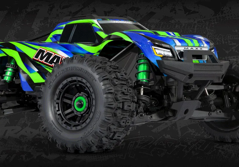 Traxxas has totally revamped the Maxx chassis for this release. Starting on the four corners, Traxxas equipped this truck with the Sledgehammer tires. These tires feature an open-block design that clears away mud allowing for unreal traction. Moving to the suspension, Traxxas then equipped the truck with the WideMaxx suspension set. This extends the width over 1.5 inches improving stability. To further add to the stability, a longer chassis is used allowing allowing the use of larger and more powerful batteries. All of these features come together to make the Traxxas Maxx an extremely durable and stable chassis. With six colors to choose from, the Traxxas Maxx with WideMaxx will be able to exceed expectation.