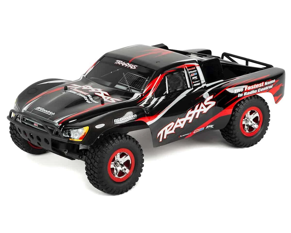 The award-winning Traxxas Slash Short-Course Race Truck puts you in the drivers seat for intense fender-to-fender, high-flying off-road action. The full-scale Short-Course Race Trucks embody the spirit of Traxxas R/C with their extreme 900+ horsepower racing engines full-throttle, dirt-roosting power slides, giant suspension travel, and Supercross-style big-air jumps. The Traxxas Slash brings all the action home so you can experience the high-speed head-to-head competition at the track or in your own backyard. The Slash was inspired by the TORC™ (Traxxas Off-Road Championship™) Pro 2WD class. The Pro 2WD class specifies rear-wheel drive trucks purpose built to fly over jumps and rip full-throttle through the turns. The Traxxas Slash hangs it out for an all new way to challenge your driving skills. The 4-wheel independent suspension has been carefully tuned to replicate the Pro 2 driving and handling experience as closely as possible. The scale appearing tires provide just the right amount of bite and thick, blinding clouds of dirt roost.