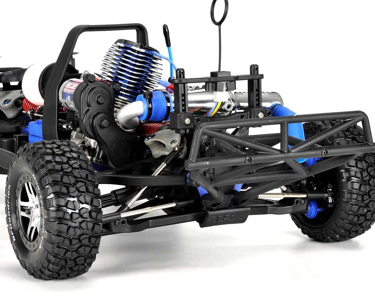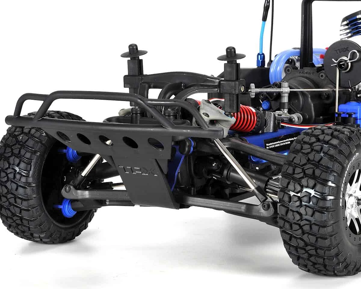 For those who like their horsepower raw and screaming at the red line, Slayer Pro 4X4 delivers with the award-winning nitro fury of the TRX 3.3 Racing Engine. Slayer Pro 4X4 punches hard with massive torque off the line and a wide powerband—bury the throttle at anytime to send all four tires into a raging fury of roosting dirt. The TRX 3.3 Racing Engine features a precision composite slide carburetor, PowerTune™ cooling head, dyno-proven IPS crankshaft, multi-port rear exhaust, and the starting convenience of the exclusive Traxxas EZ-Start system.