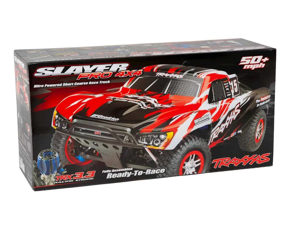 The Slayer Pro 4X4 delivers the screaming sound and ballistic thrust that every nitro driver craves. Now with a 10% larger footprint, Slayer Pro 4X4’s long wheelbase chassis and wide track stance deliver unmatched stability in rough conditions and precision high speed cornering for incredible side-by-side, fender-banging racing action.