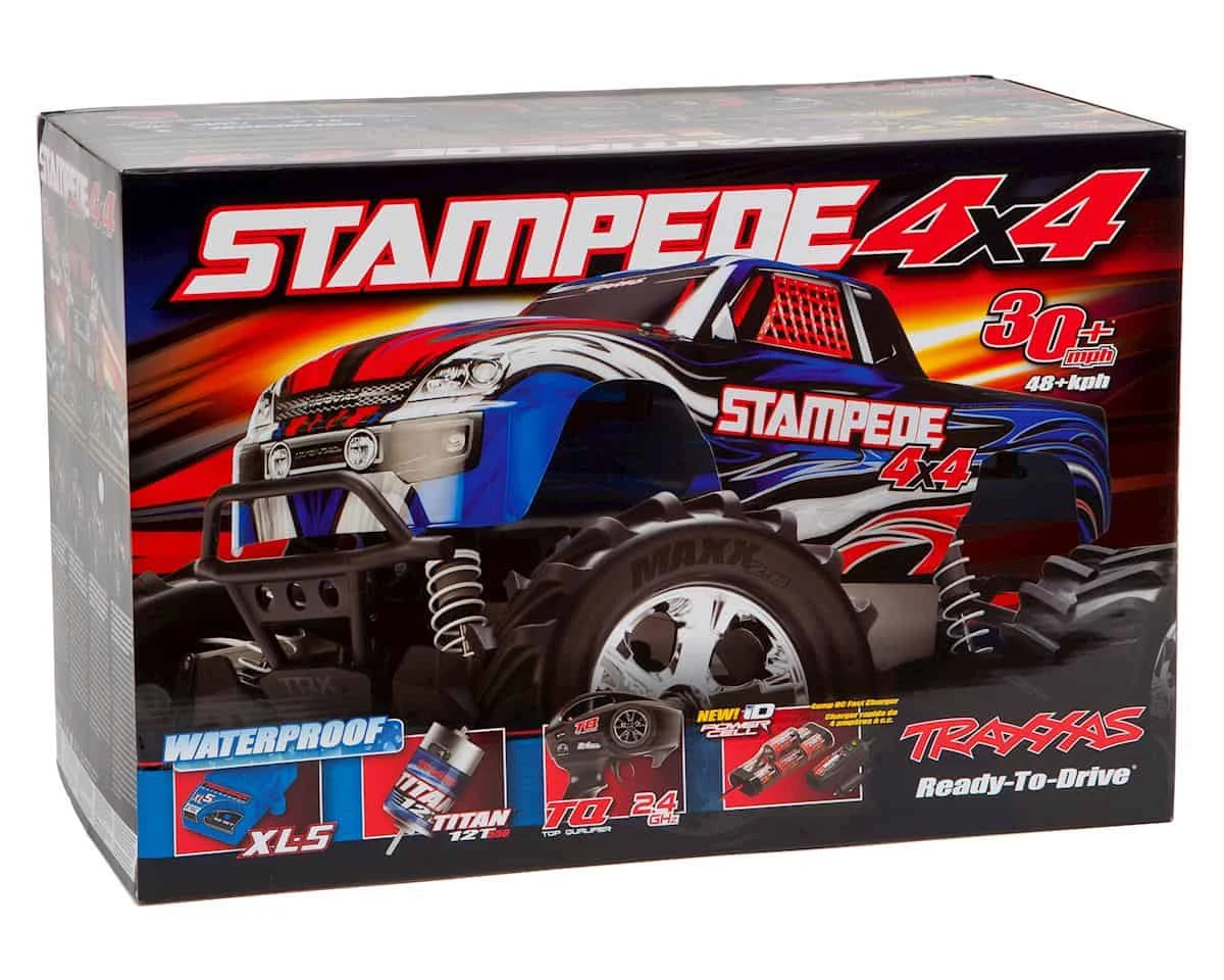 This is the Traxxas Stampede 4X4 LCG RTR 1/10 Scale Monster Truck, with an included TQ 2.4GHz Radio System, 7-Cell 3000mAh NiMH Battery Pack, 4 AMP Peak Detecting DC Charger and blue body. Now featured with this kit are the updated Traxxas iD connectors now included as standard equipment.